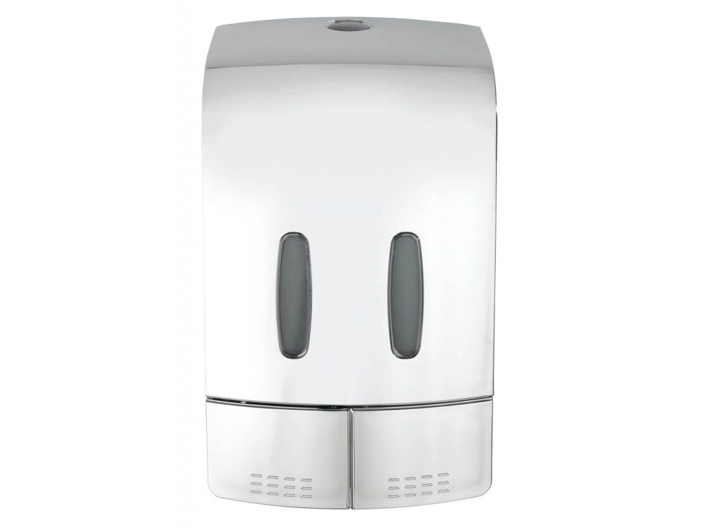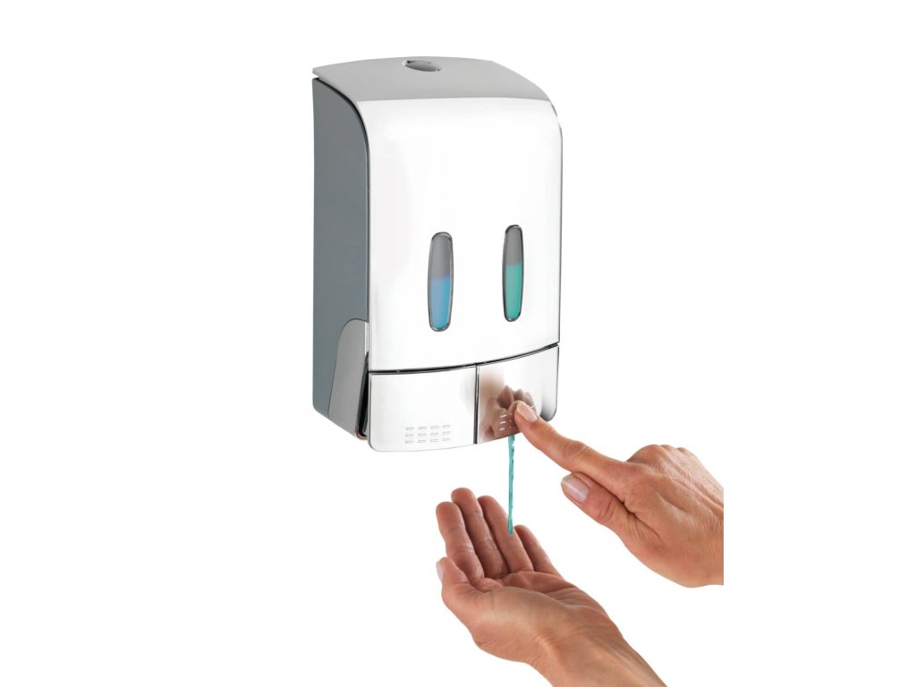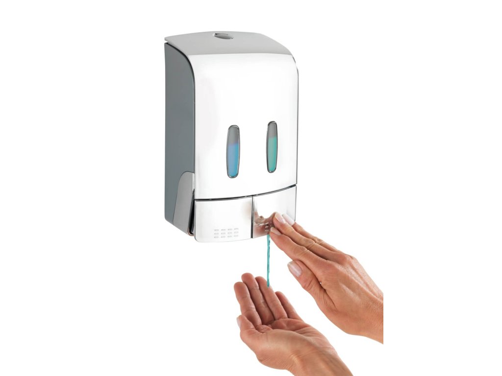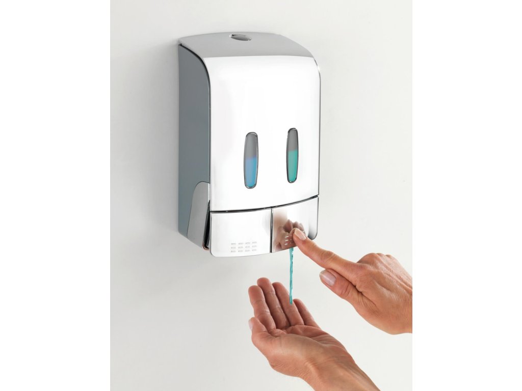 Die gewünschte Menge wird einfach per Knopfdruck abgegeben. Die beiden Kammern können bis zu einem Volumen von je 480 ml getrennt voneinander befüllt werden, so dass z.B. in eine Kammer Desinfektionsmittel und in die andere Seife eingefüllt werden kann.