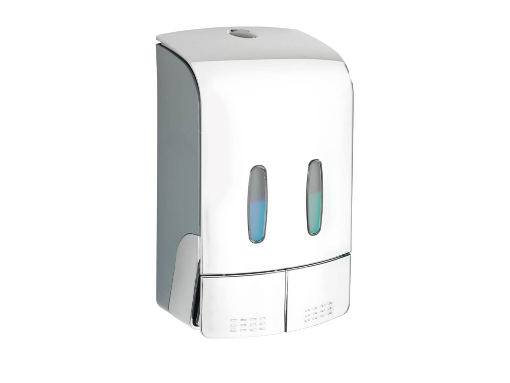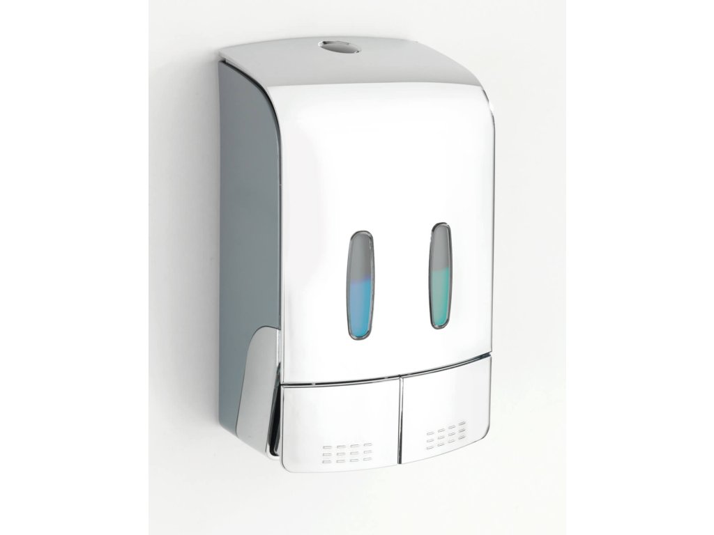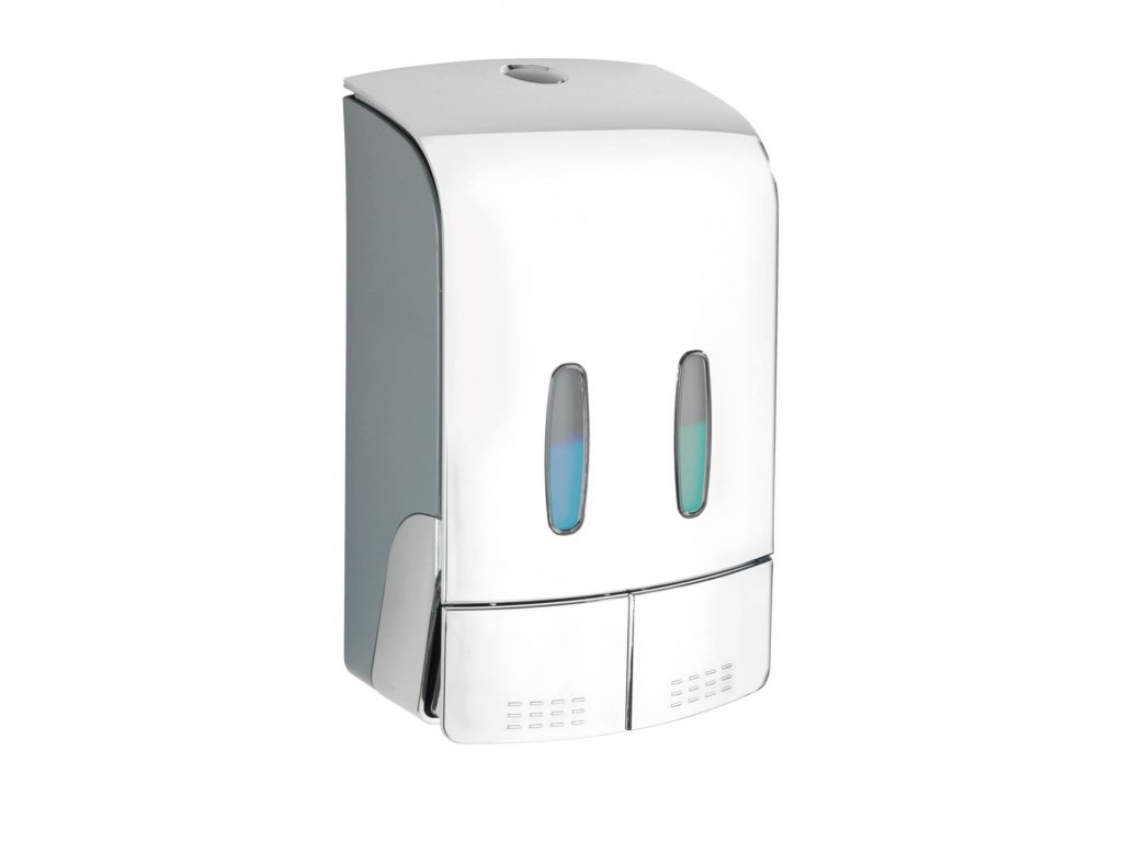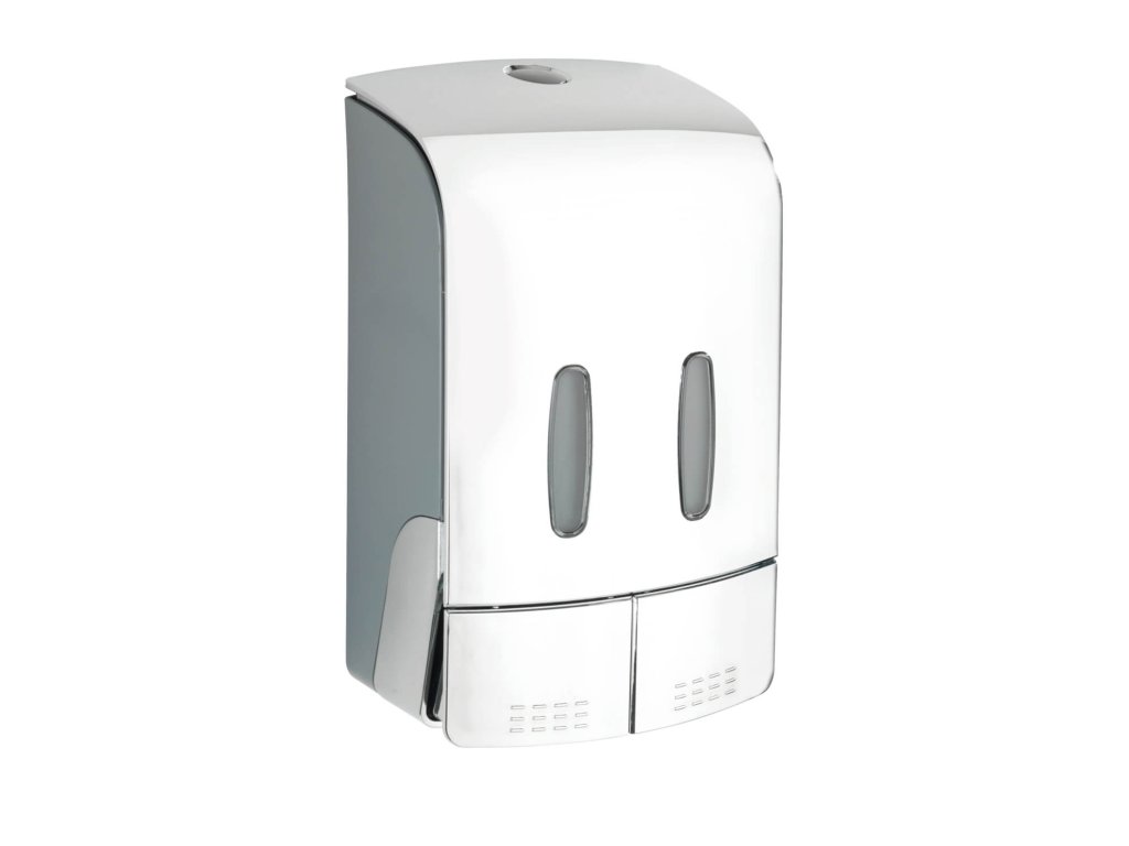 Die gewünschte Menge wird einfach per Knopfdruck abgegeben. Die beiden Kammern können bis zu einem Volumen von je 480 ml getrennt voneinander befüllt werden, so dass z.B. in eine Kammer Desinfektionsmittel und in die andere Seife eingefüllt werden kann.