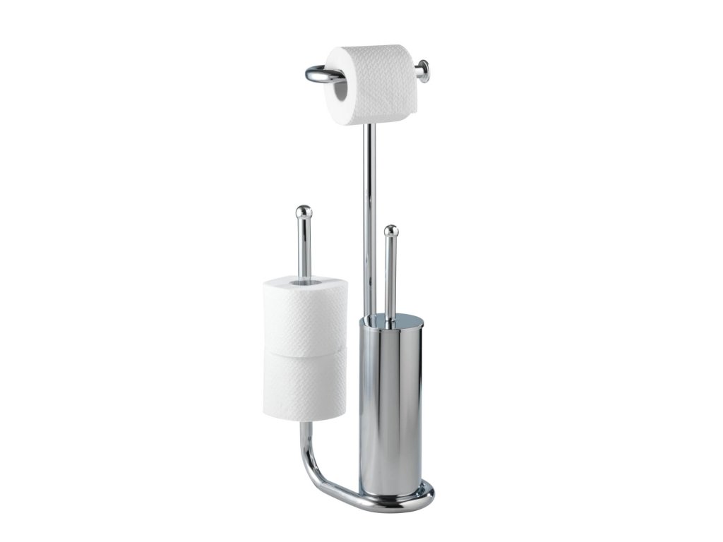 Dies ist eine praktische 3-in-1-Kombination, die aus einem geschlossenen Toilettenbürstenhalter, einem offenen Toilettenpapierhalter für den sofortigen Gebrauch und einem separaten Ersatzrollenhalter für bis zu drei zusätzliche Rollen besteht.